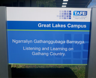 Directional and building signage at the Great Lakes campus of TAFE has had a major upgrade with input from students studying Gathang, the traditional language of the local Indigenous people. Each major sign encountered by visitors to the campus now features a welcome and explanation in the Gathang language. This recognises the important role Aboriginal people have on the campus … Read More